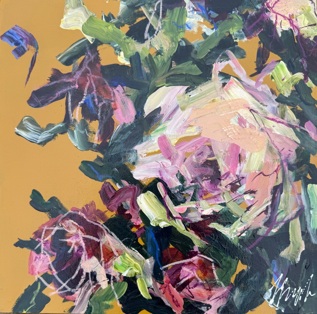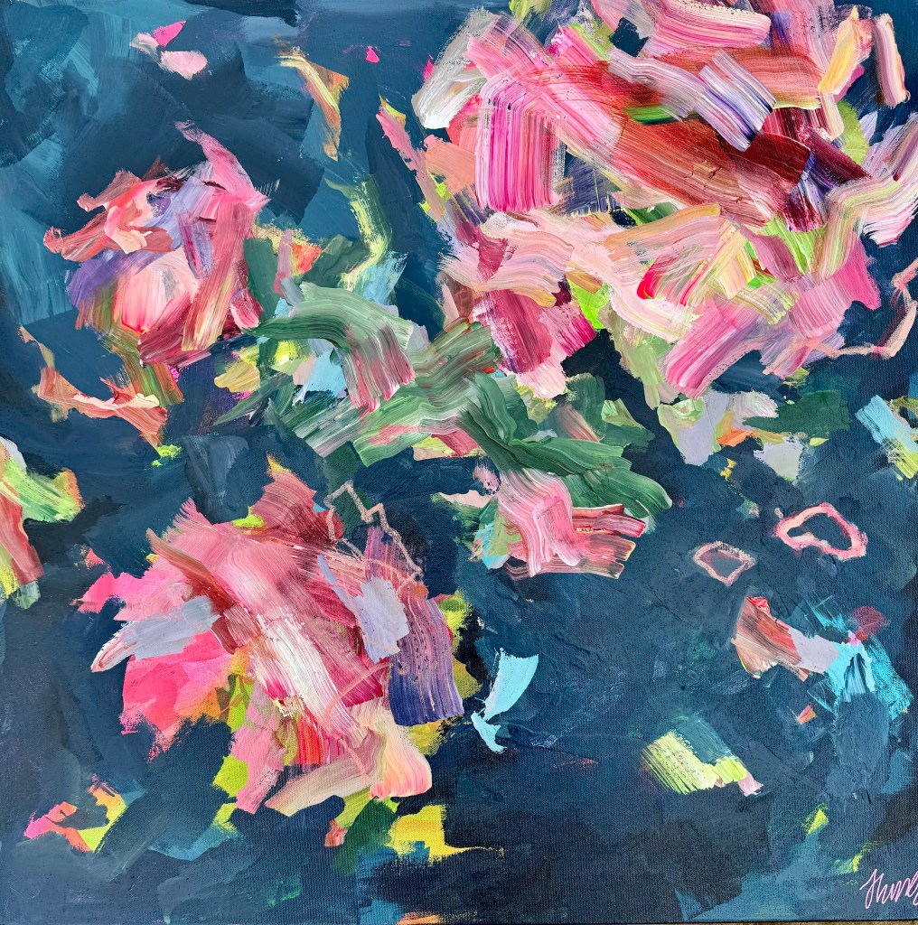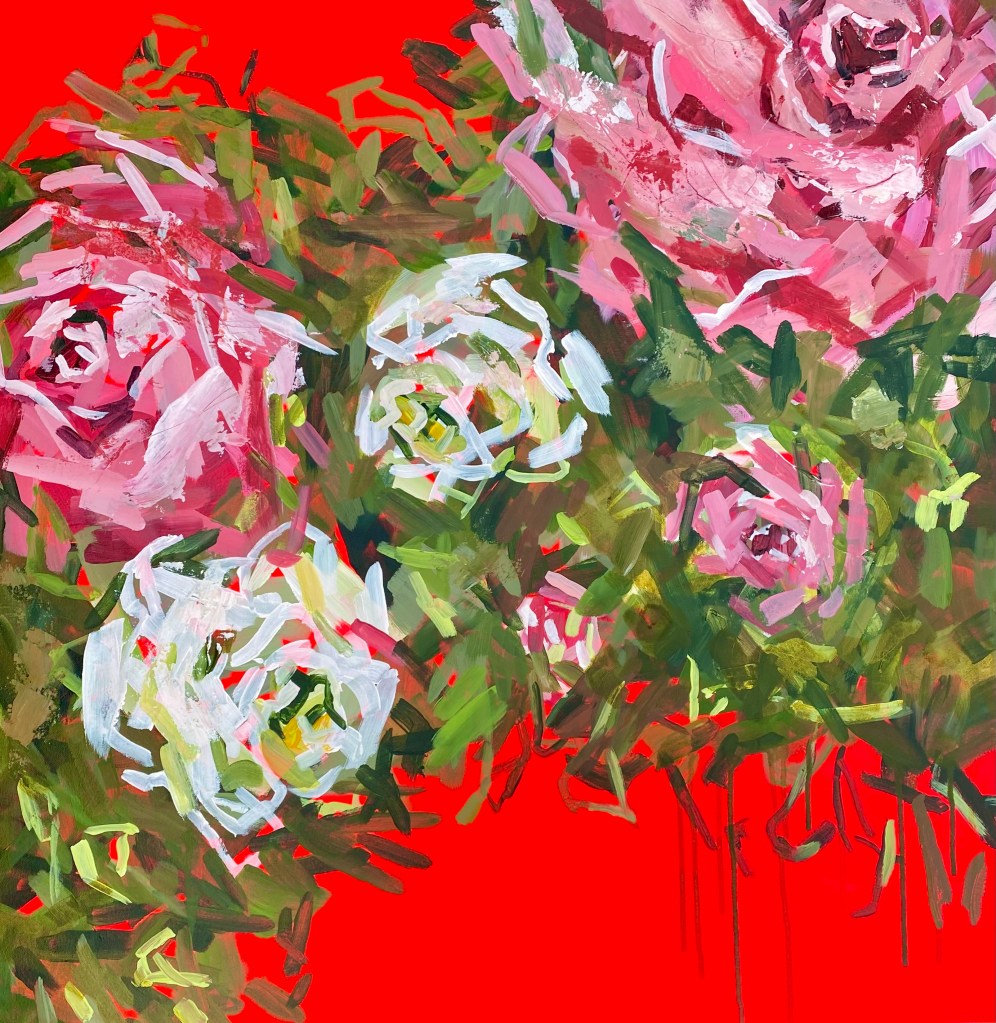This started out as a pure abstract painting but the dynamic fusion of bold crimson and soft peach evoked a sense of roses in a way I couldn’t avoid even of I had wanted to! The brushstrokes are bold and considered and a perfect pop of colour to brighten up any room.