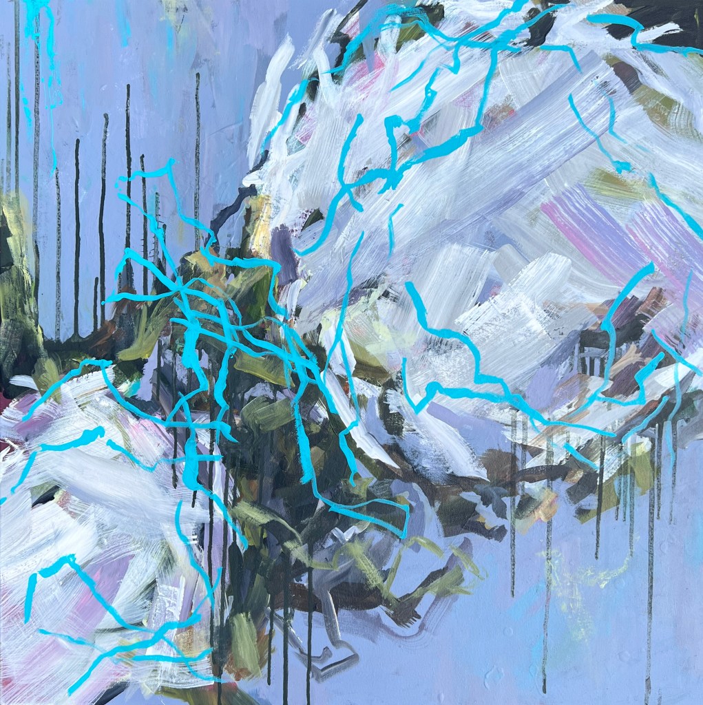 This painting proves that greys are not boring. It is dramatic with dripping greens, greys and crimsons but also restful, punctuated with soft pinks.