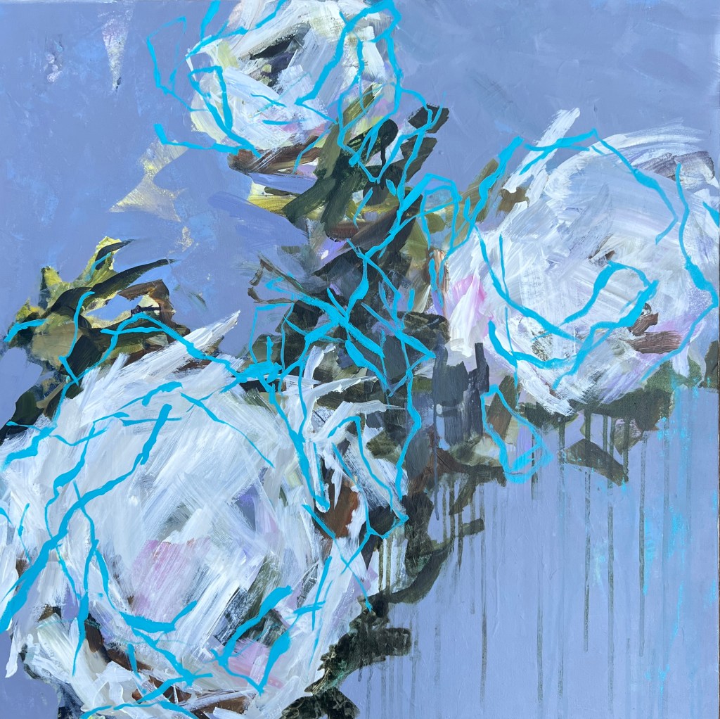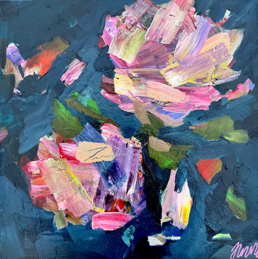 Rich and opulent, set on a deep dusky blue background. It’s captivating with its vibrant, textured brush marks, the dynamic forms seem to be caught in a moment of transformation , suspended “in between”, where anything could happen.