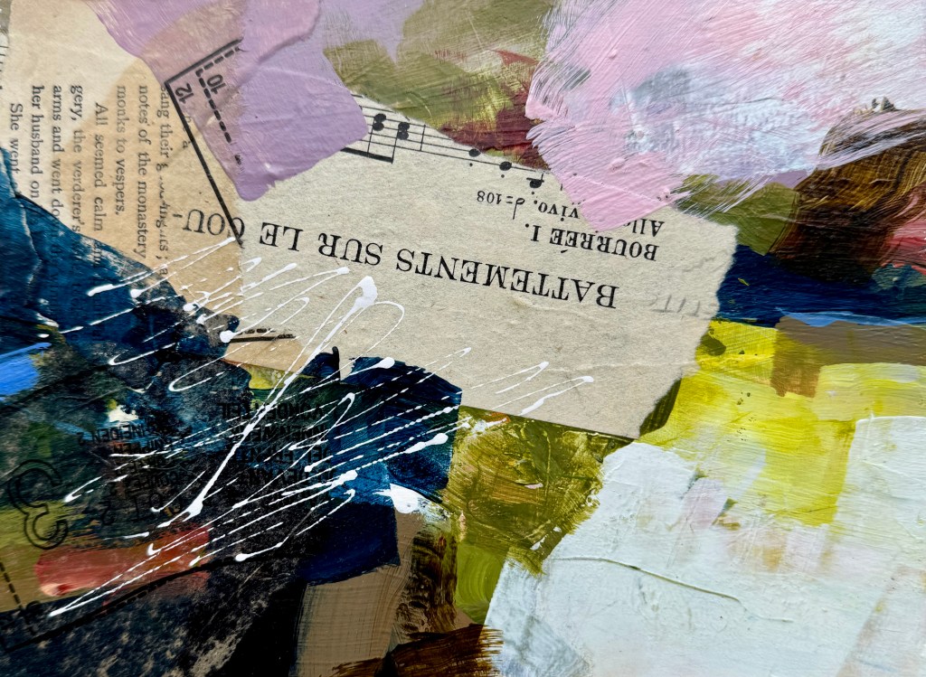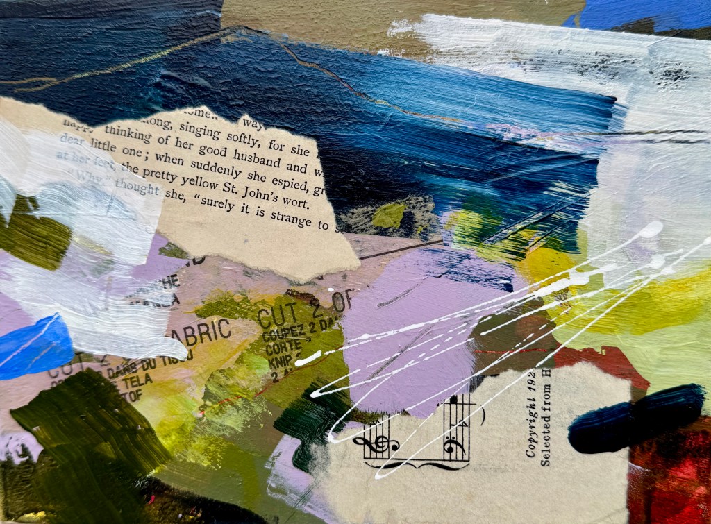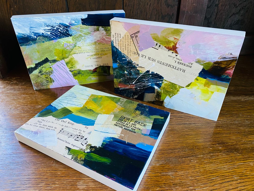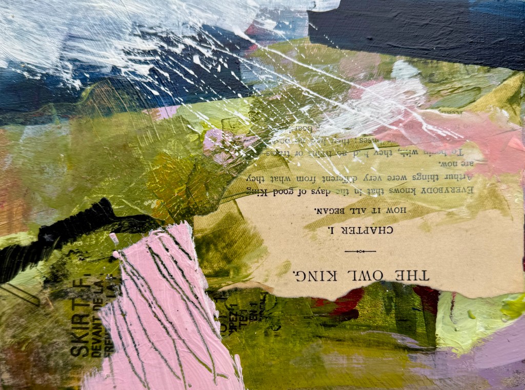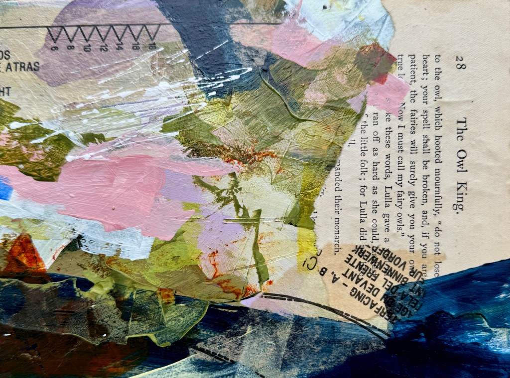 These one-off abstract paintings each contain original collaged pages from a beautiful vintage book, published in 1898 called “The Owl King And Other Fairy Tales”. Each painting is titled according to a bit of text collaged within it.