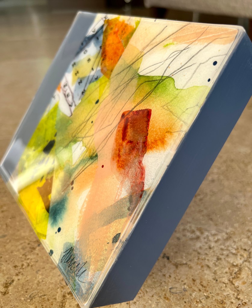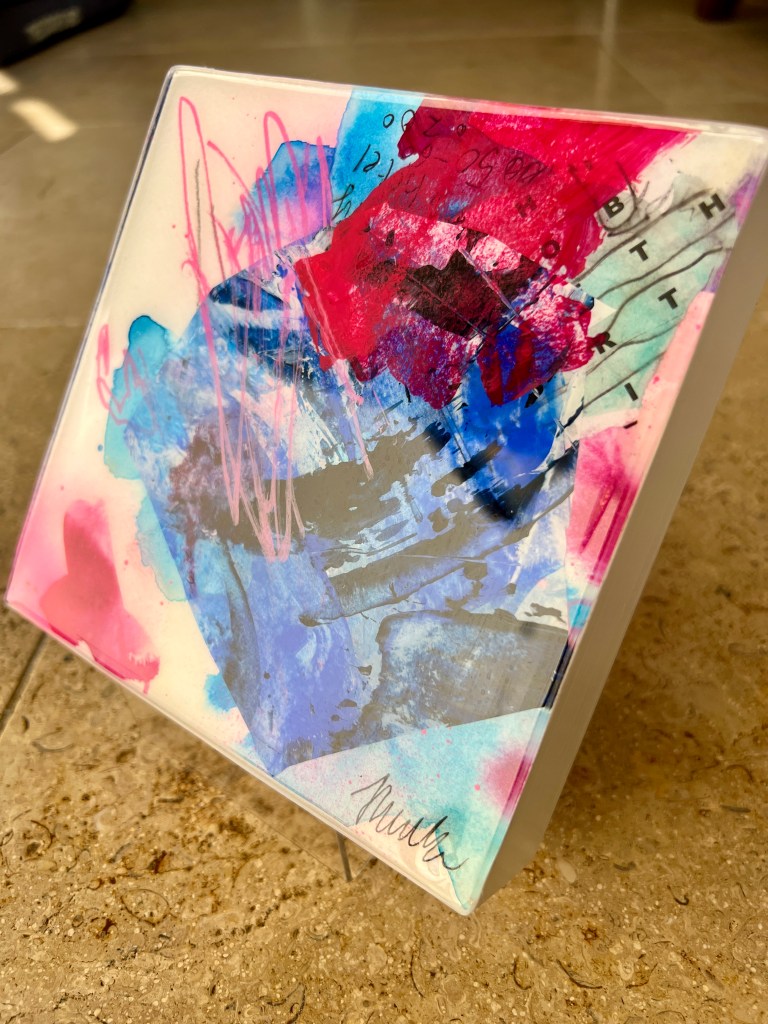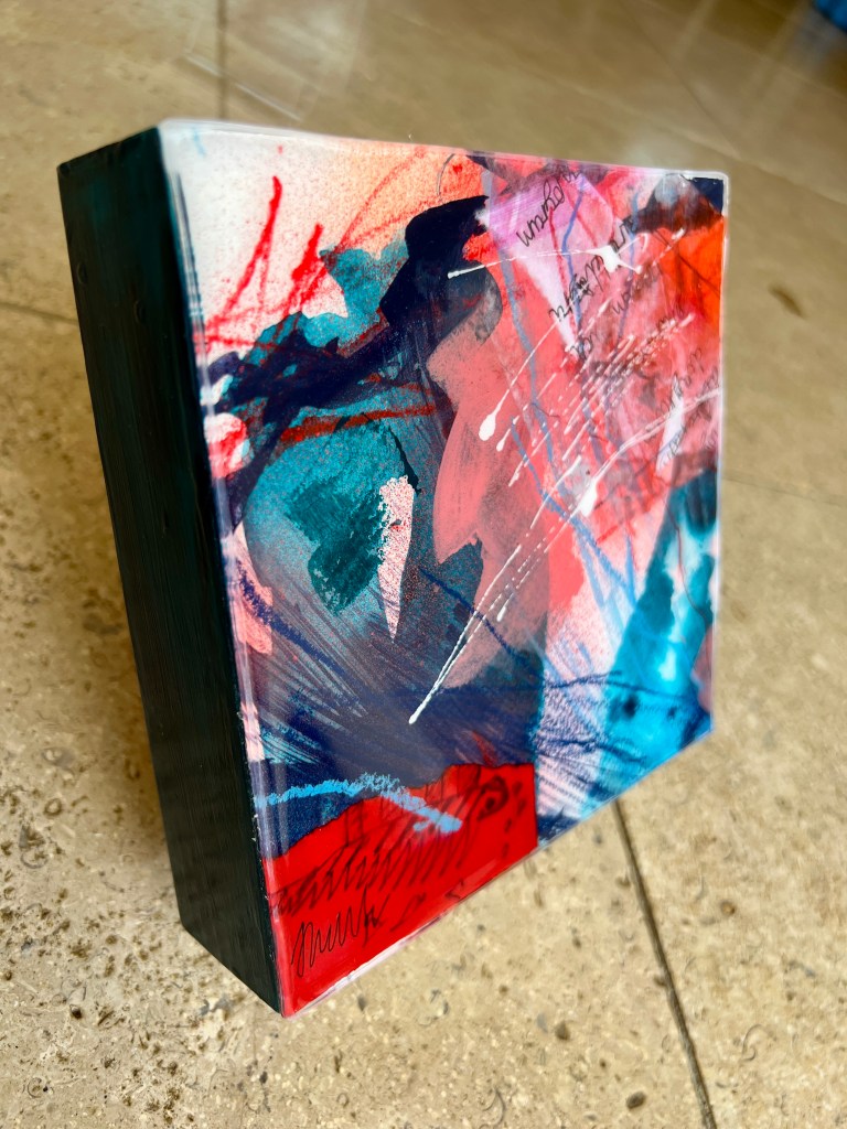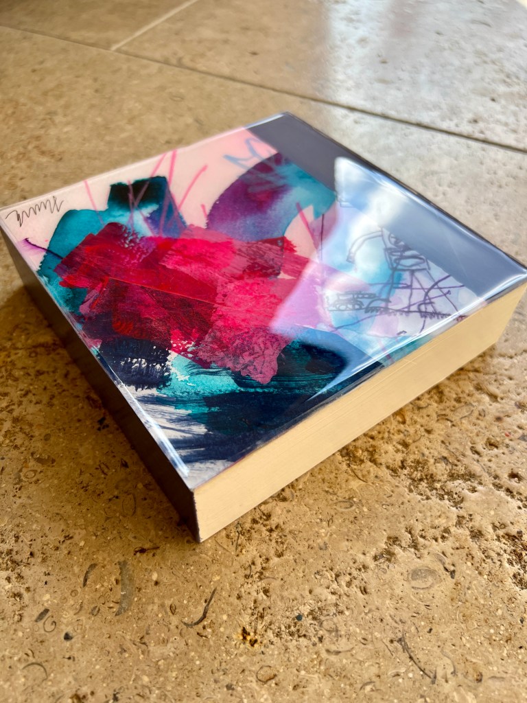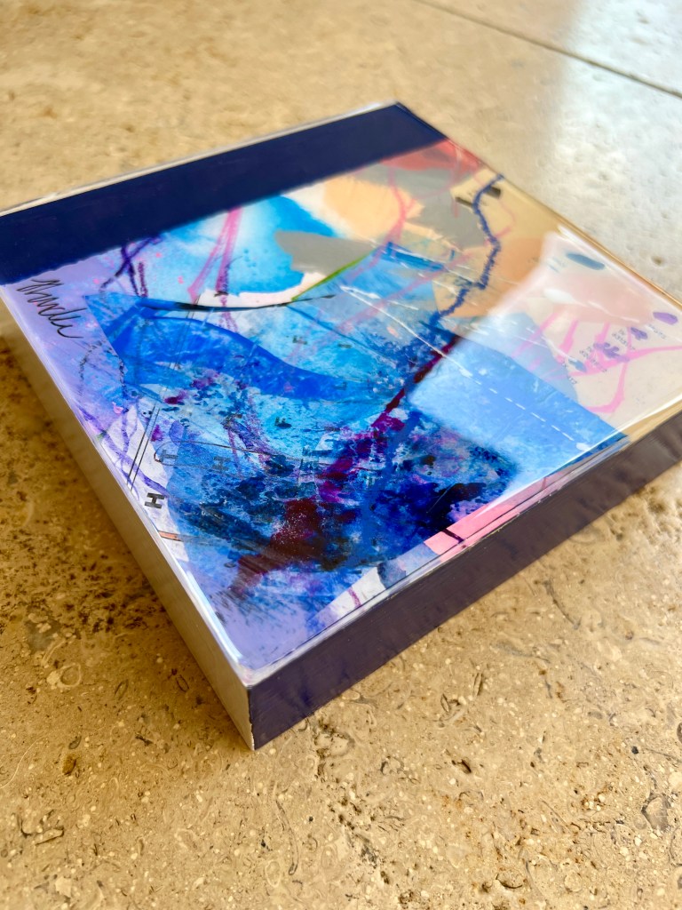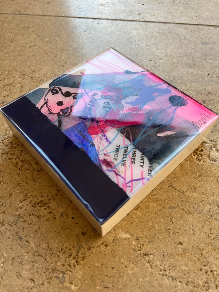 Mixed media artwork adhered to cradled wooden panel and finished with a resin topcoat