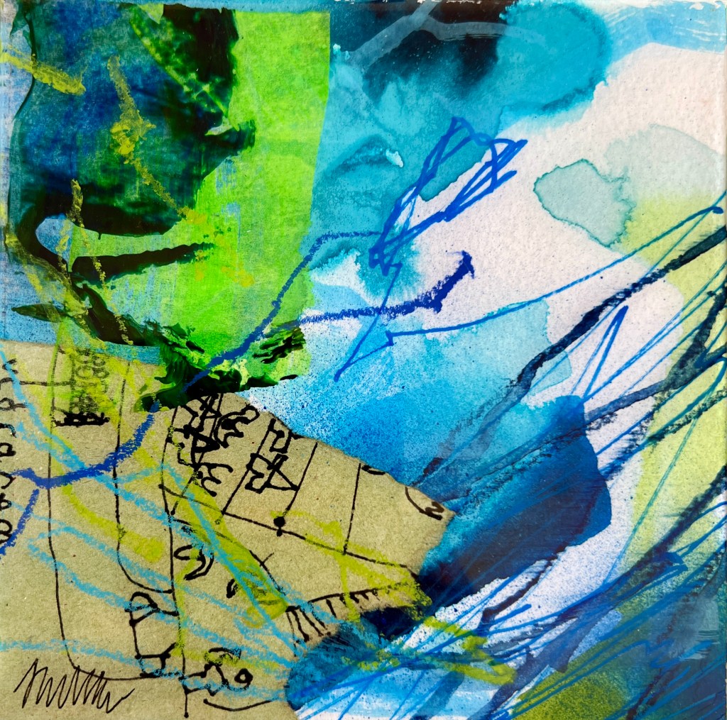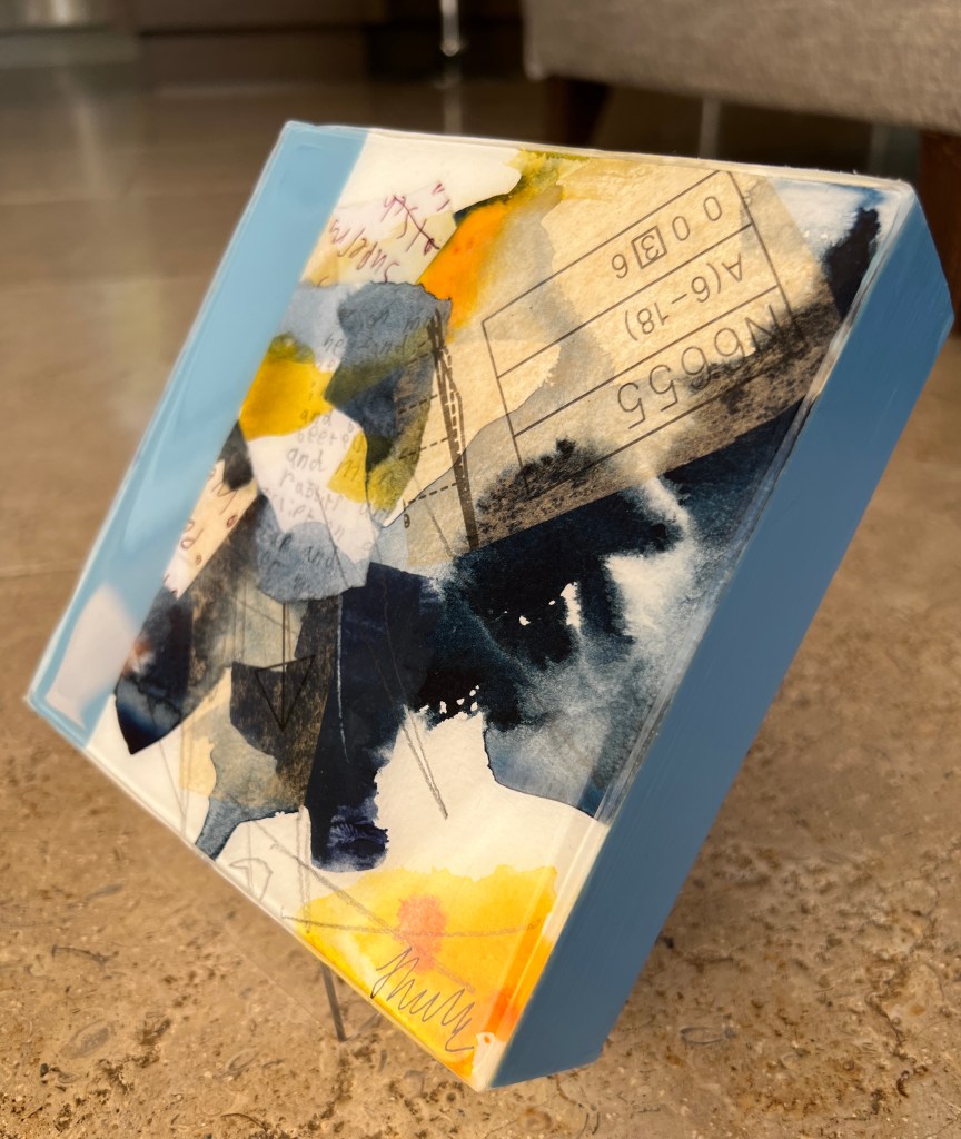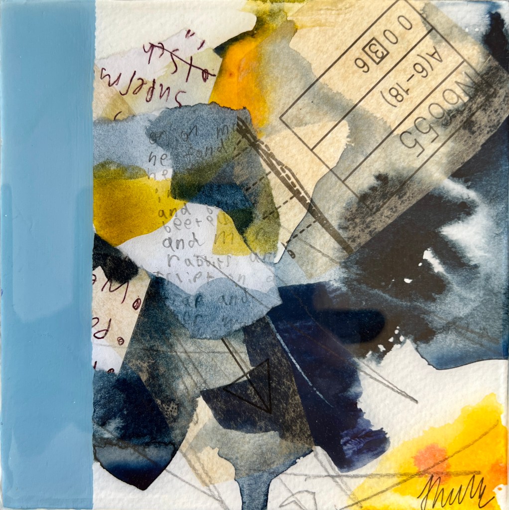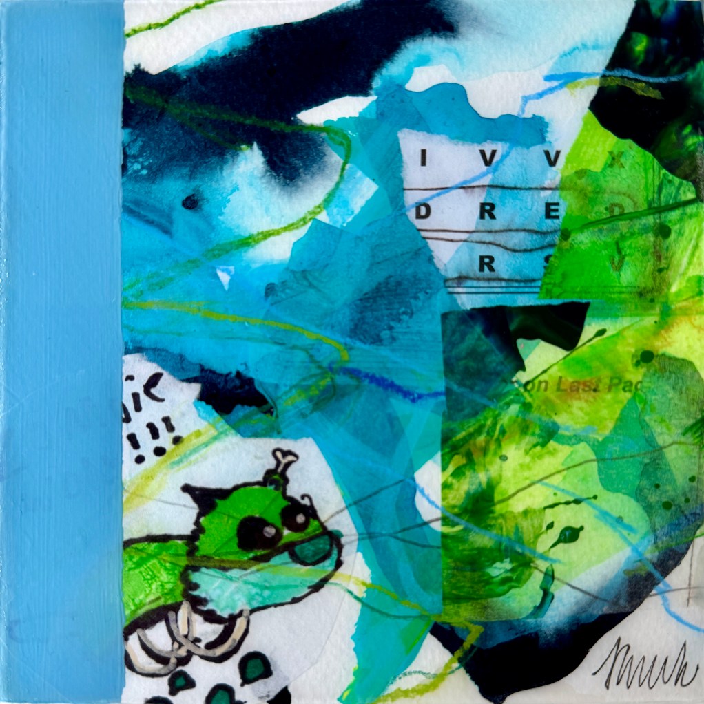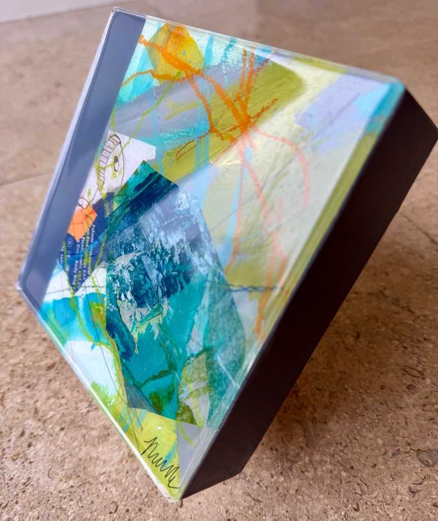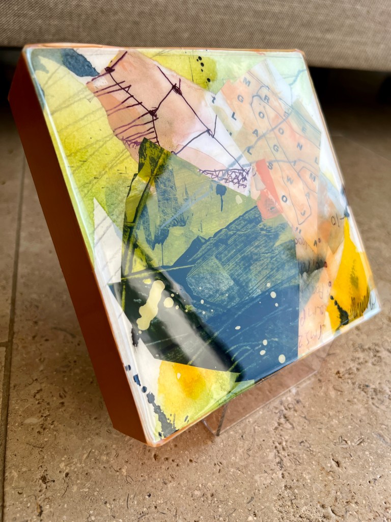 Mixed media artwork adhered to cradled wooden panel and finished with a resin topcoat.